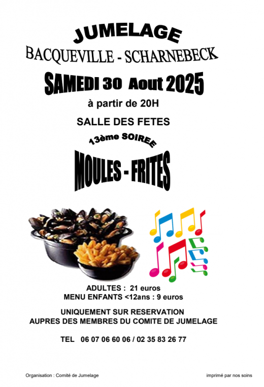 Adultes 21 € Menu enfants moins de 12 ans 9€ uniquement sur réservation auprès des membres du comité de jumelage. 06.07.06.60.06 ou 02.35.83.26.77