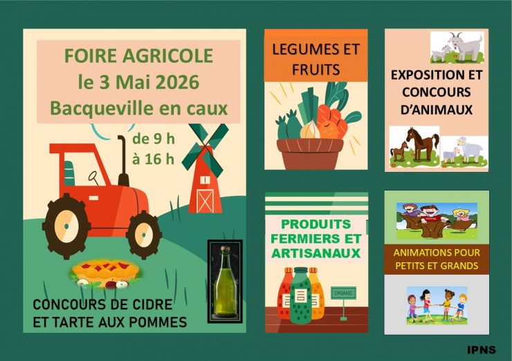 La commune de Bacqueville-en-Caux accueillera sa foire agricole le dimanche 3 mai 2026, de 9h à 16h.